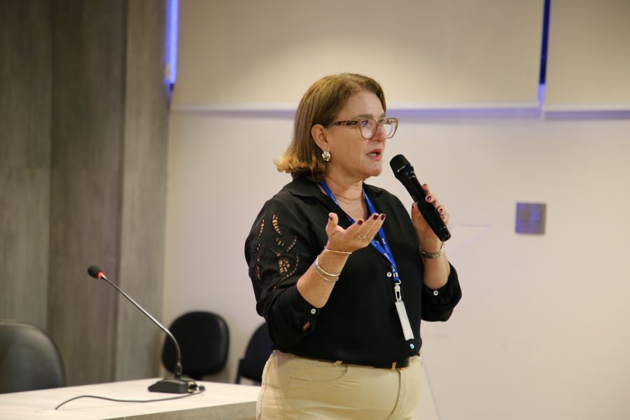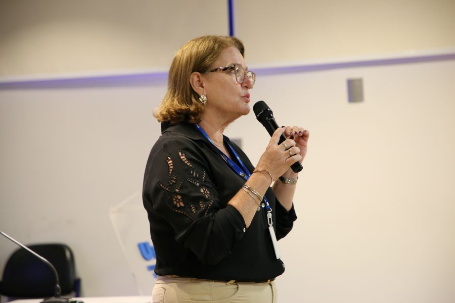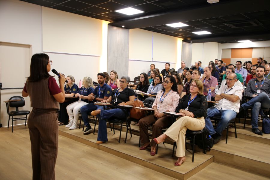 A assessora pedagógica da Pró-Reitoria de pós-graduação e Extensão, Rita Amorim, apresentou o diagnóstico elaborado a partir das contribuições enviadas pelos docentes no primeiro workshop. O levantamento identificou níveis de compreensão sobre as funções do NDE e mapeou o que já é realizado, o que precisa ser aprimorado e o que ainda não foi colocado em prática.