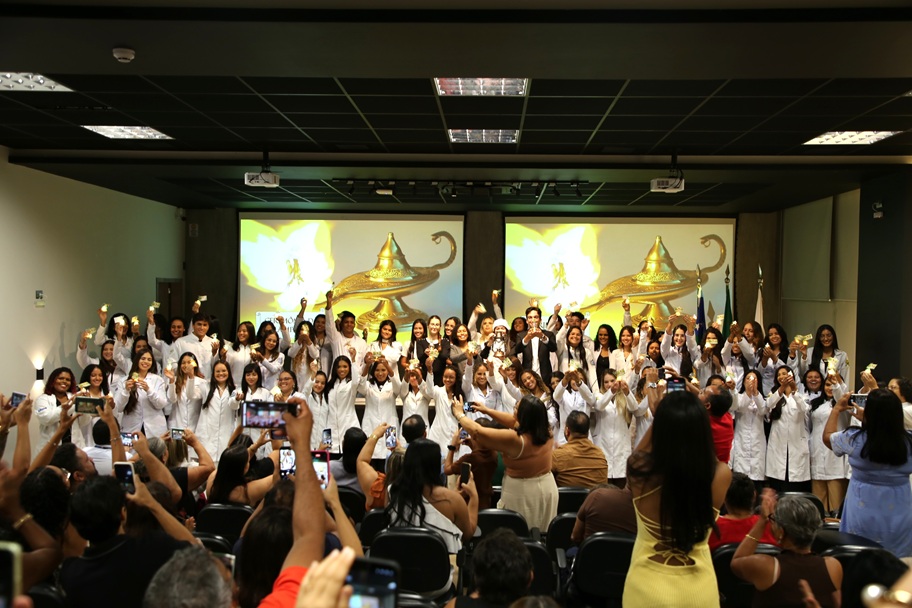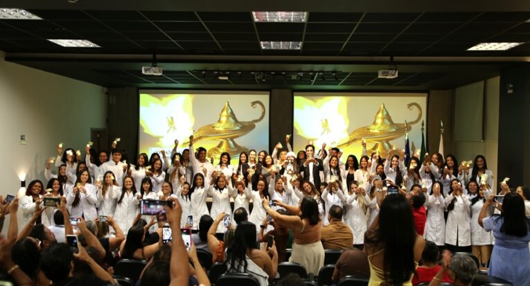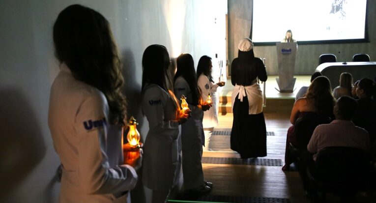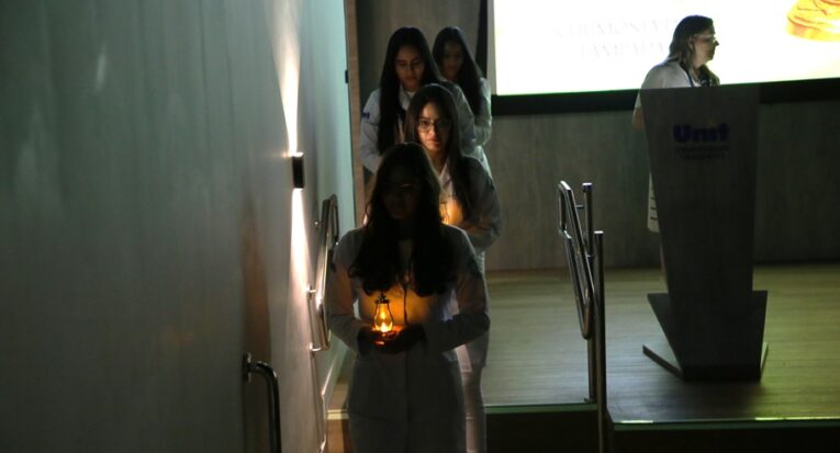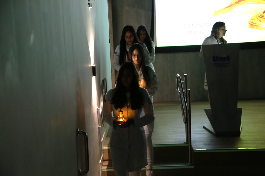 Uma chama que, ao ser mantida acesa, é capaz de iluminar e fortalecer a busca pela cura de uma doença ou da cicatrização de uma ferida. Assim pode ser definida a lâmpada, objeto-símbolo da Enfermagem, em torno da qual se celebra uma tradicional cerimônia de passagem e acolhimento para os calouros que começam a fazer o curso. A Cerimônia da Lâmpada, dedicada aos 97 alunos do primeiro ano de Enfermagem da Universidade Tiradentes (Unit), foi realizada nesta segunda-feira, 24, no Auditório Padre Arnóbio, do Campus Farolândia. O evento durou cerca de duas horas e reuniu também as famílias e amigos dos calouros, além de alunos veteranos, professores e coordenadores do curso.