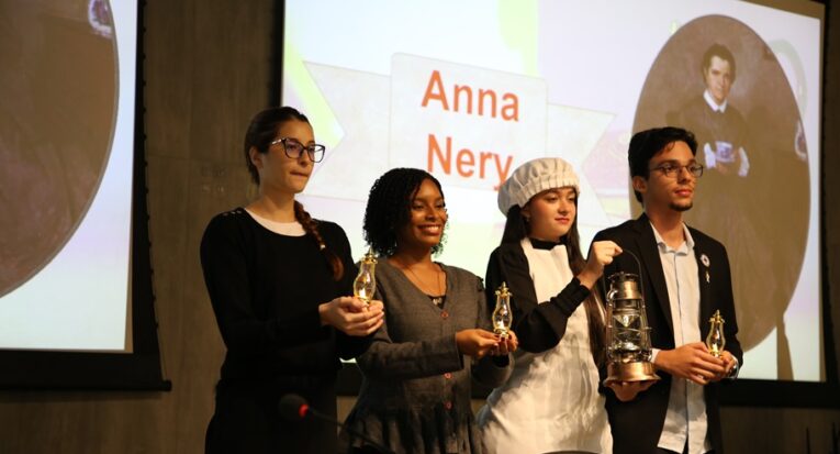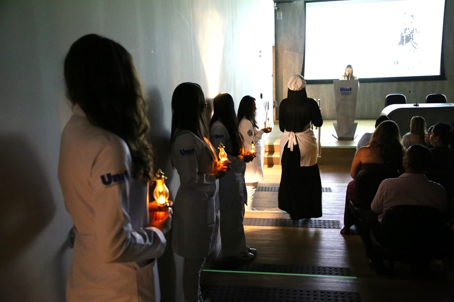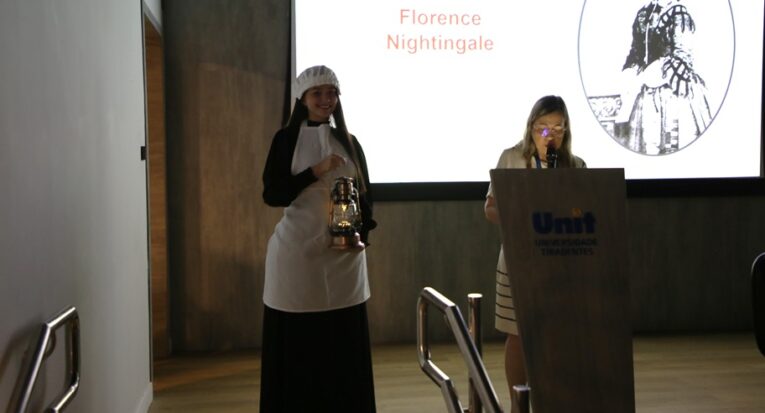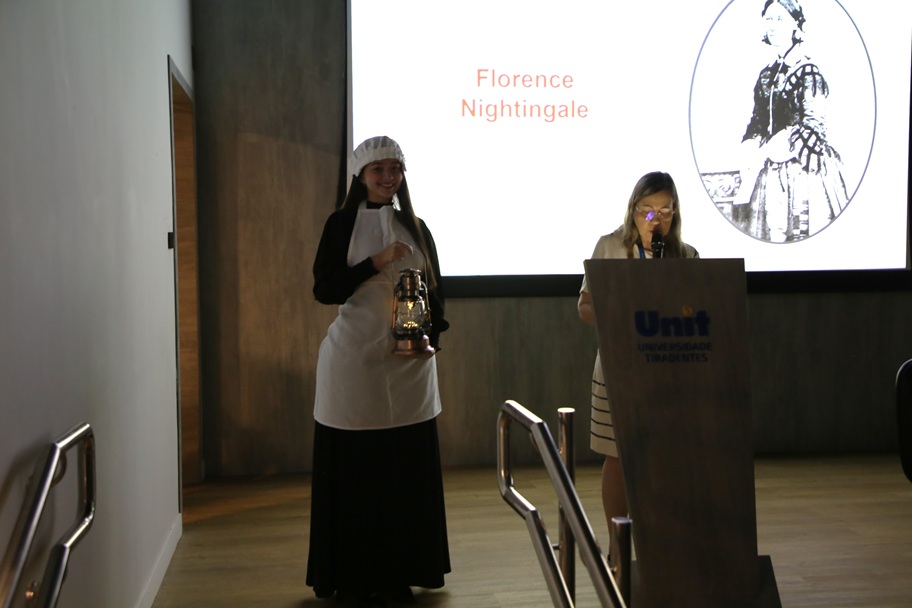 Em seguida, com as luzes apagadas no auditório, algumas alunas veteranas entraram carregando lâmpadas acesas, enquanto Emília explicava sobre o surgimento e os princípios da Enfermagem, além de suas principais precursoras, representadas com roupas de época. Florence Nightingale foi interpretada pela estudante Ana Letícia Leite Mota, do sétimo período. “Ela representa a lição de que a gente como enfermeiro deve levar luz para os pacientes, tratá-los de forma humanizada, focando realmente no cuidado dele. Isso vai inspirar os novos alunos e frisar essa ideia que deve ser seguida”, disse ela, antes de entrar acompanhada por outros três alunos que representavam outros três pioneiros da Enfermagem: a jamaicana Mary Seacole (1805-1881), a brasileira Anna Nery (1814-1880) e o norte-americano Luther Christman (1915-2011).