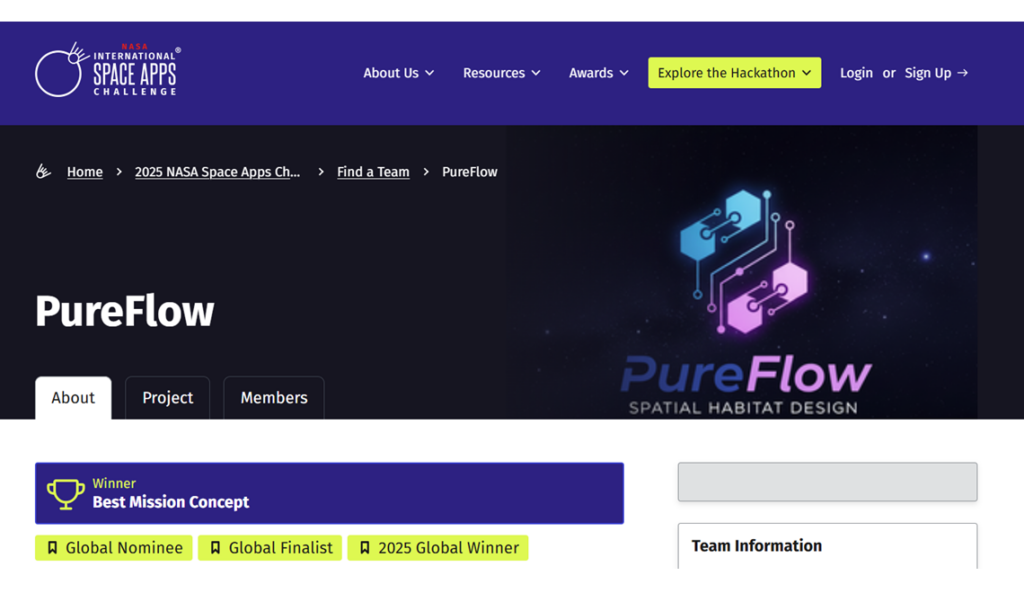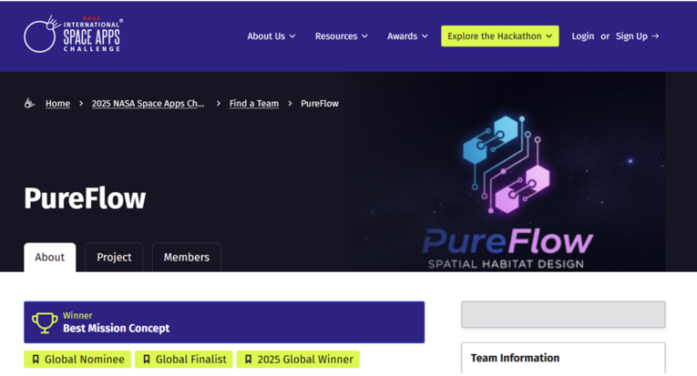 O projeto dos alunos da Unit, que venceu a categoria Best Mission Concept (Melhor Conceito de Missão), foi o da PureFlow, uma plataforma de engenharia de sistemas para criação, modelagem e validação da viabilidade de habitats espaciais, locais que servem de apoio para astronautas durante as missões fora da órbita da Terra. A ferramenta, que é diretamente conectada ao API Donki, sistema de previsões climáticas e ambientais da NASA, foi desenvolvida pela própria equipe sergipana, que apesar de terem pensado todo o projeto a ideia na semana que antecedeu o início da etapa local do evento, em outubro passado, já estava formada e entrosada há mais tempo.