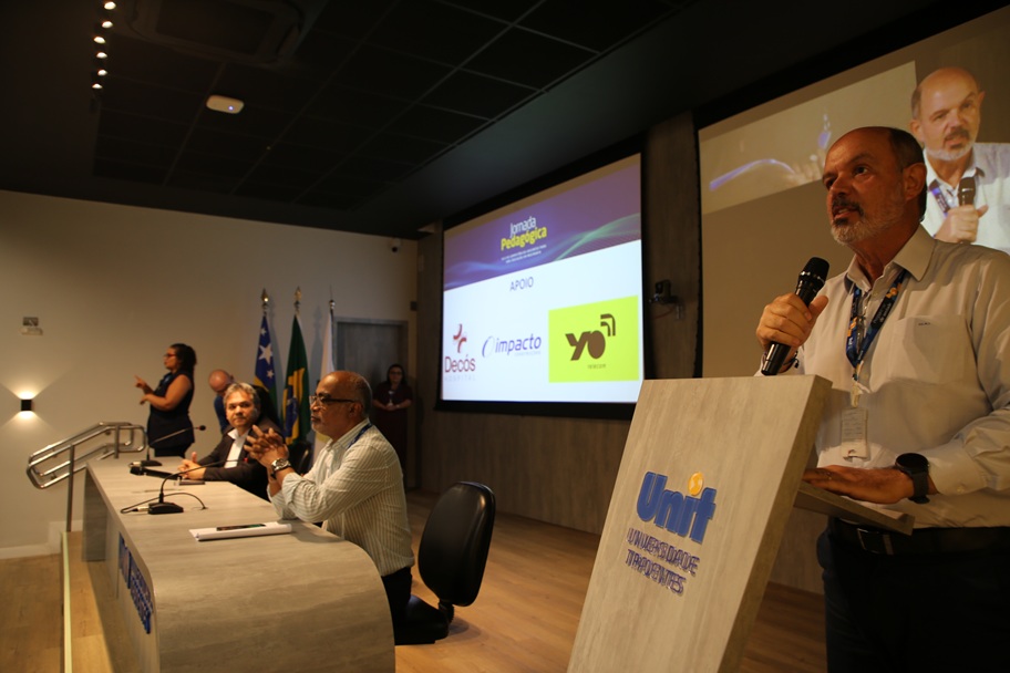 O diretor acadêmico da Unit, Marcos Wandir Nery Lobão, também saudou os professores e falou sobre a importância de um diálogo cada vez maior entre os docentes e a gestão, com o objetivo de fortalecer a presença da instituição na sociedade e qualificar ainda mais o trabalho de formação. “A gente precisa trazer cada vez mais vocês para o mais próximo e além da sala de aula, com ideias para discutir com a gente, não só no âmbito das pró-reitorias, mas também na diretoria. Somos uma instituição onde as diretorias estão dentro desse campus aqui e a gente precisa dialogar mais. Estamos prontos para dialogar, para ouvir e escutar vocês. E através de vocês, nós vamos também alcançar os nossos alunos que precisam também ter uma participação muito mais ativa dentro da nossa instituição”, afirma Wandir.