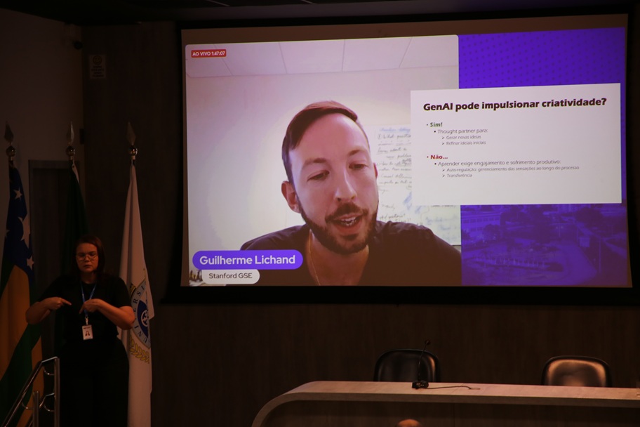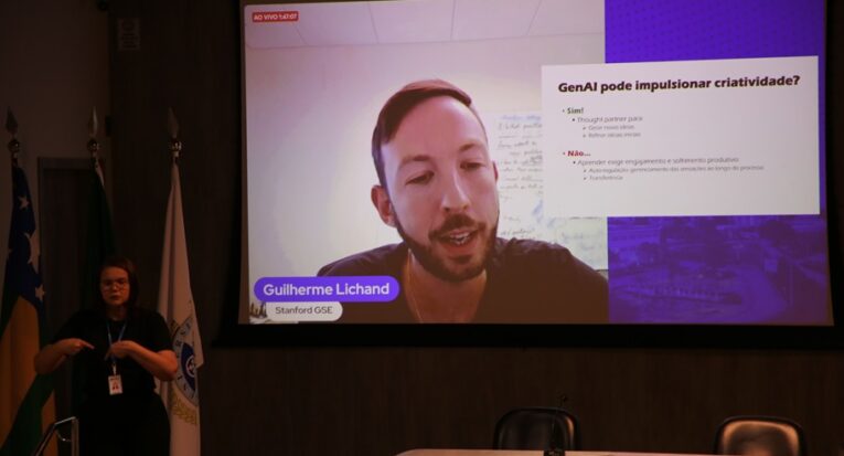 O tema foi abordado pelo pesquisador e economista brasileiro Guilherme Lichand, que é professor-assistente da Stanford University, na Califórnia (Estados Unidos) e também atua como pesquisador na área educacional. Ele falou sobre “O desenvolvimento da criatividade em tempos de inteligência artificial”. A palestra virtual, transmitida direto dos EUA, foi mediada pelo pró-reitor de Graduação e Extensão, Ronaldo Linhares, que igualmente chamou a atenção para a importância e a atualidade do tema no ensino superior.